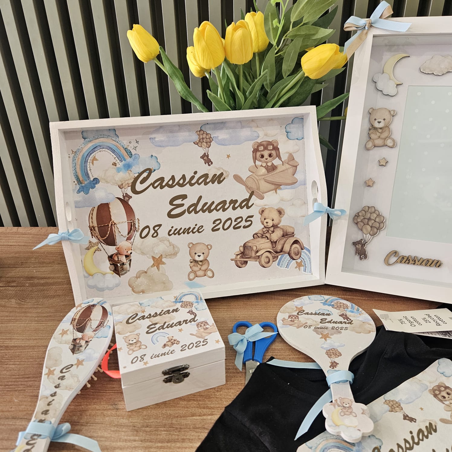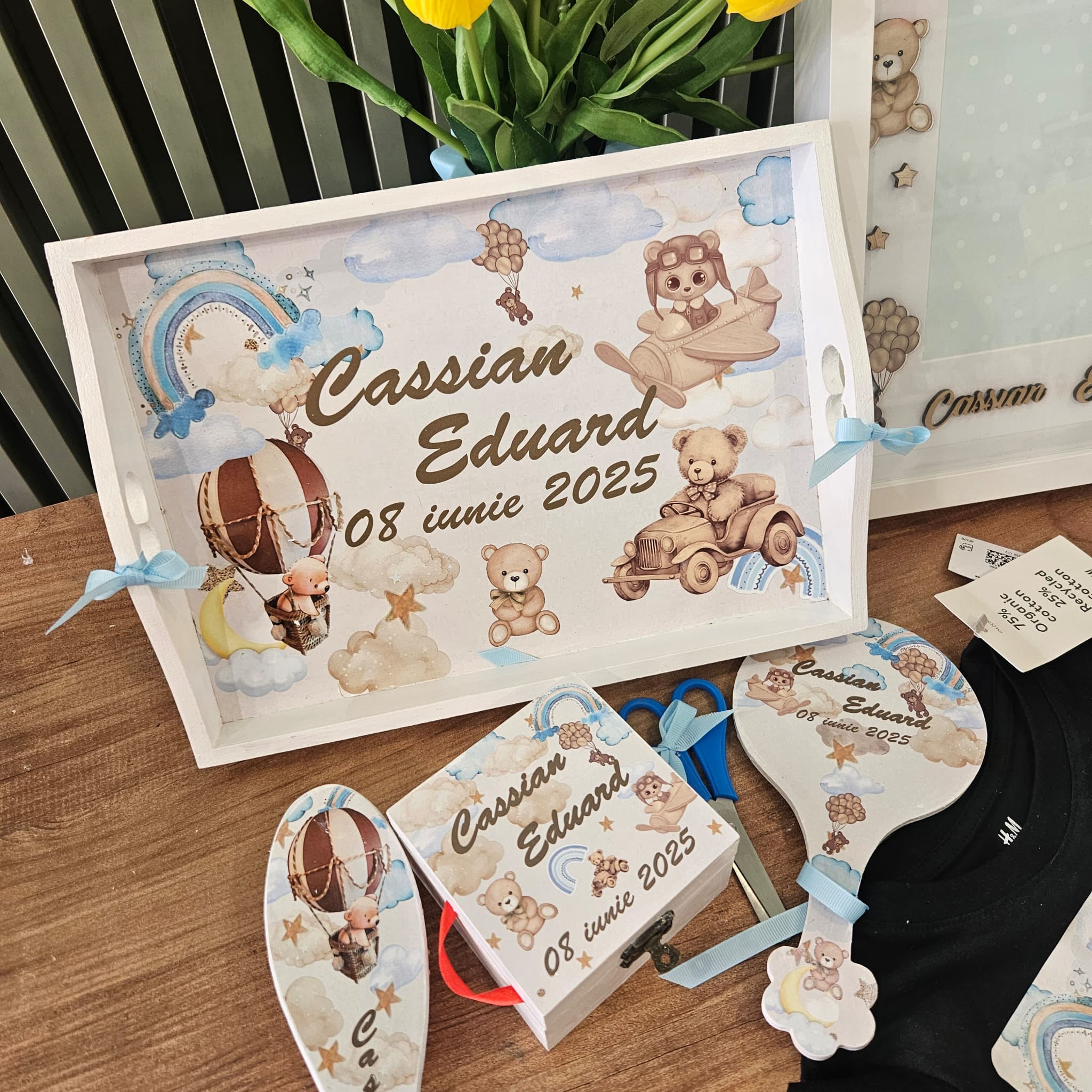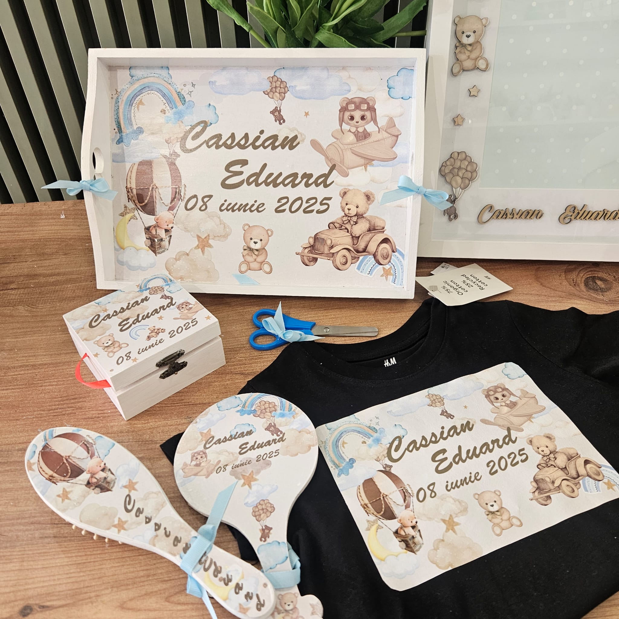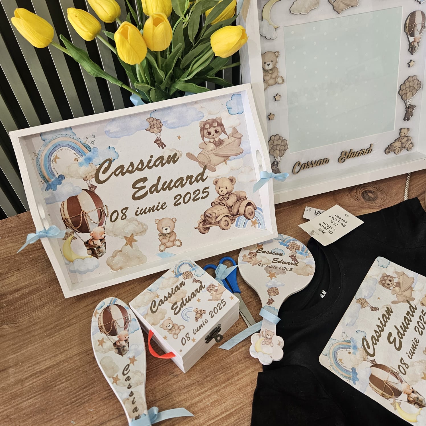 Setul se poate personaliza cu grafica dorită, nume și data evenimentului. Dispunem de o varietate largă de tematici din care vă puteți alege personalizarea setului. Durata de realizare variază între 7 – 15 zile calendaristice, în funcție de complexitate. După stabilirea detaliilor se percepe un avans de 40% din suma totală. Produsele personalizate nu se pot returna.