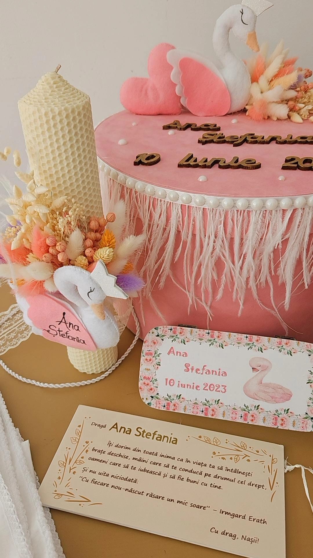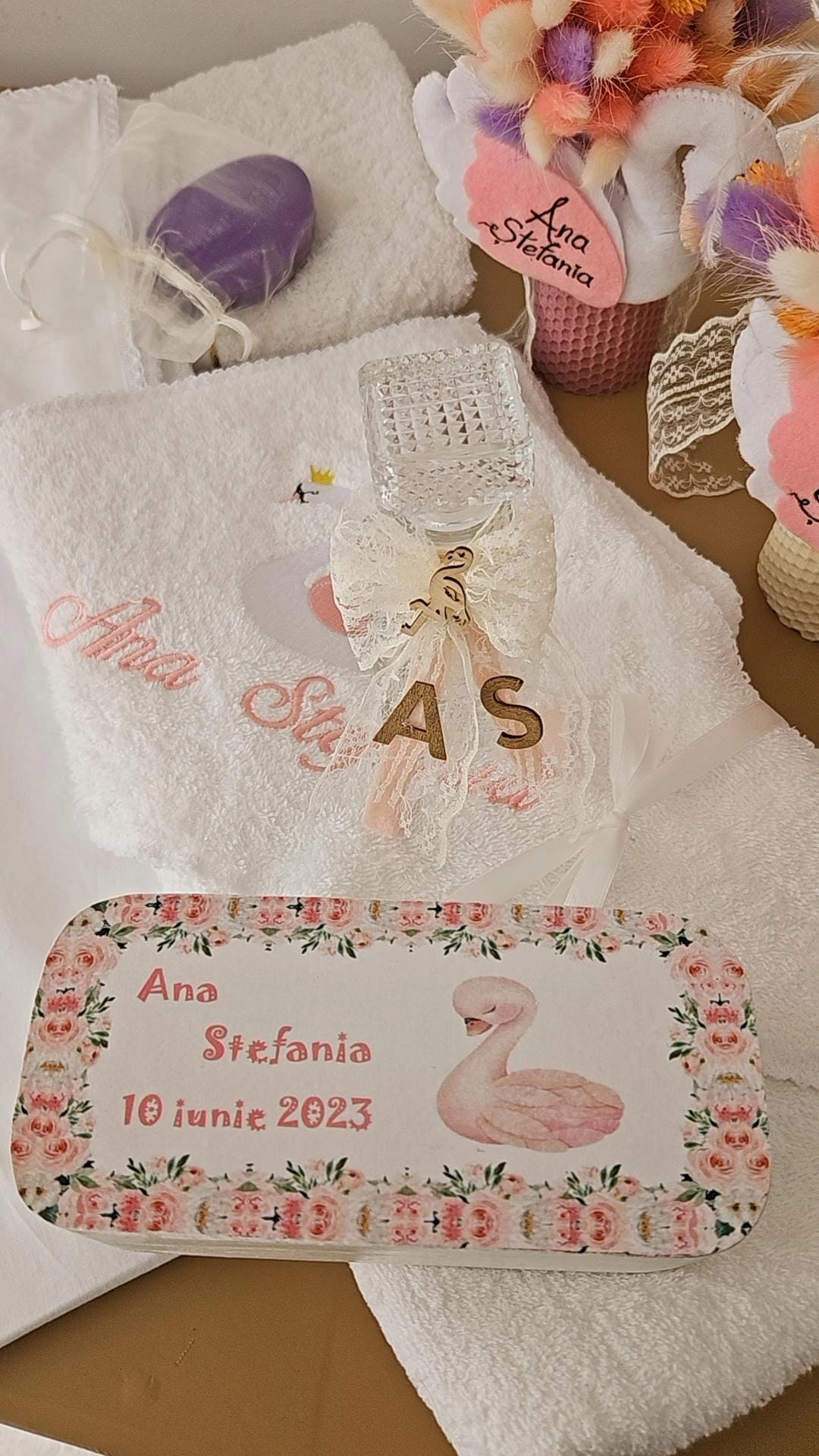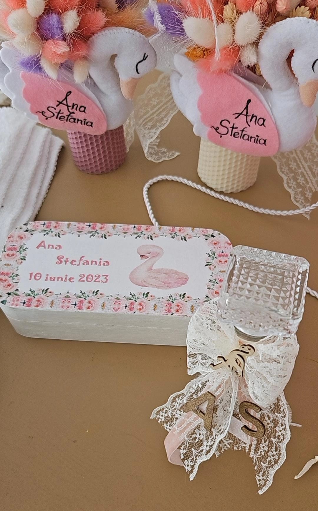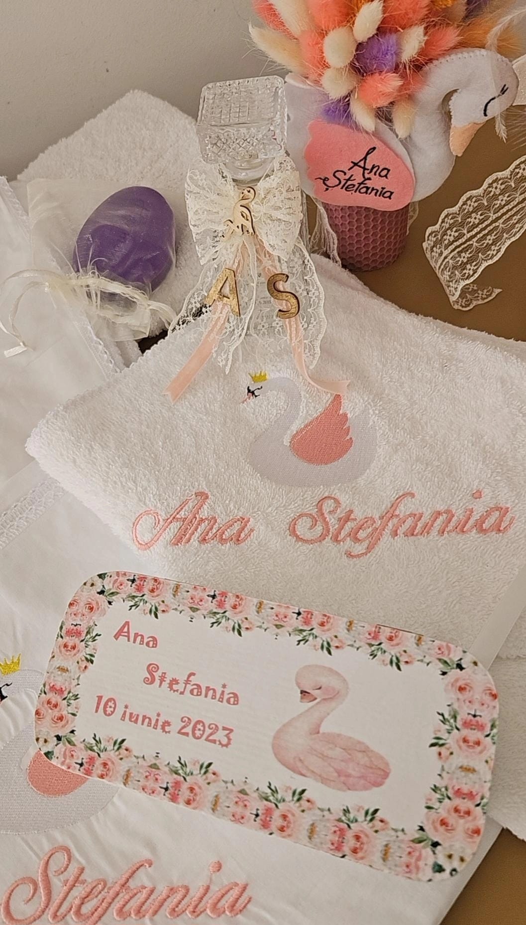 Setul de botez se poate realiza cu orice tematică dorită, dispunem de o varietate largă de broderii din care vă puteți alege personalizarea trusoului. Cutia decorată, trusoul personalizat și lumânarea pot fi achiziționate și separat. Durata de realizare variază între 7 – 15 zile calendaristice, în funcție de complexitate. După stabilirea detaliilor se percepe un avans de 40% din suma totală. Produsele personalizate nu se pot returna.