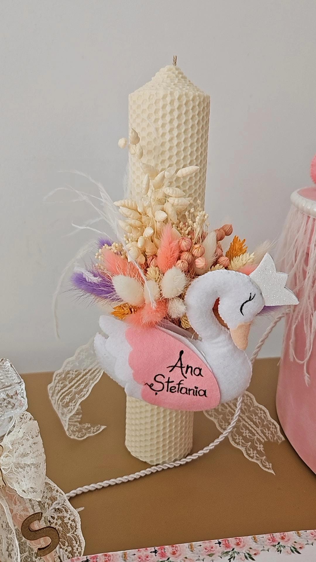 - Lumânare botez din ceară naturală(dimensiune H30/D5.5 cm) accesorizată cu flori criogenate și stabilizate și figurină fetru.