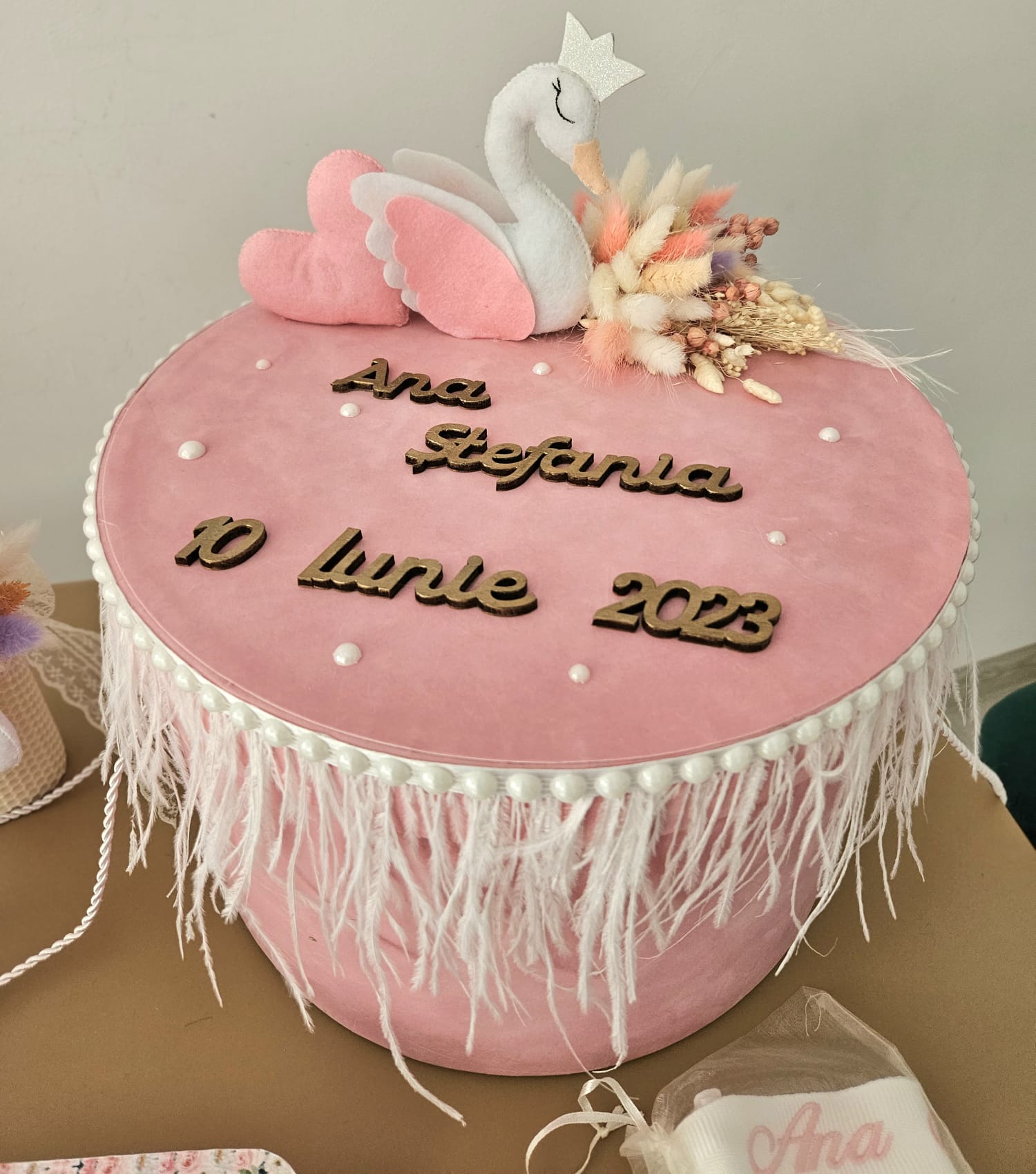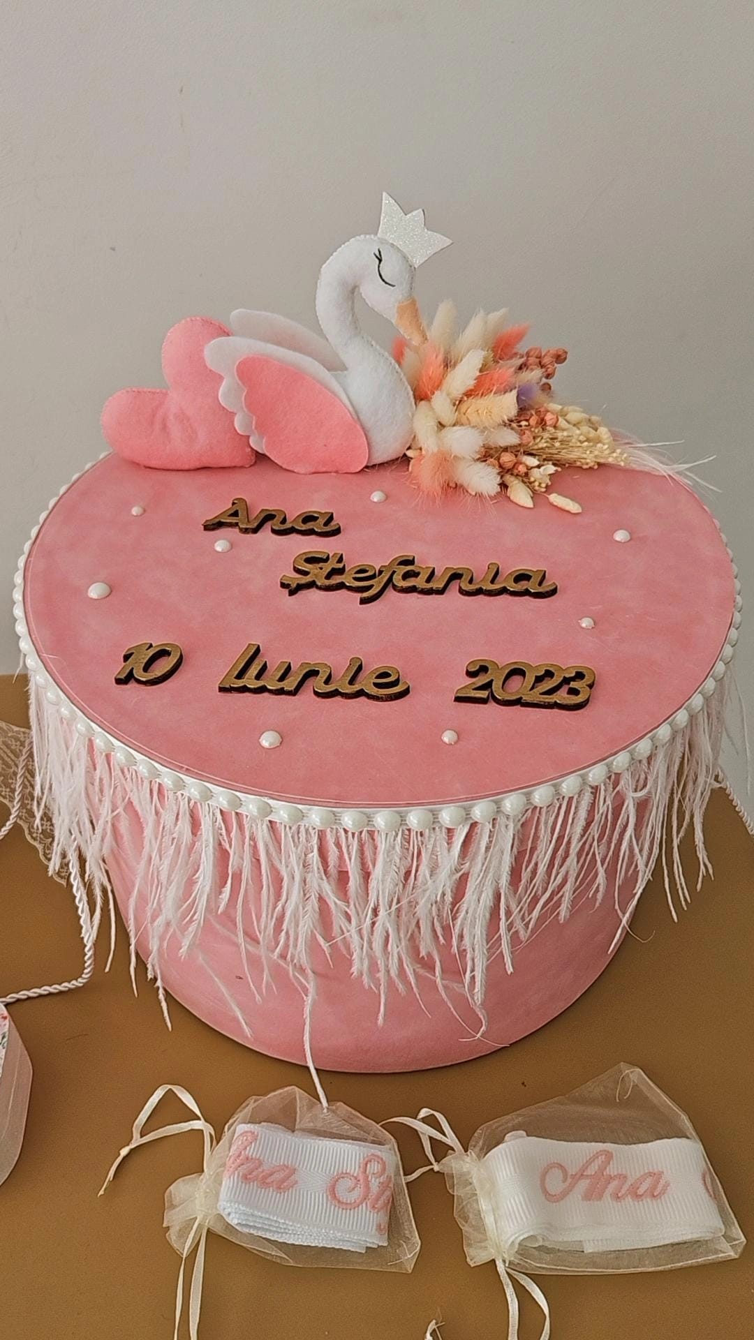 - Cutie catifea D31/H 17 cm accesorizată cu elemente din fetru, elemente din lemn, perle, fulgi flori criogenate și stabilizate, finisată manual. Se poate personaliza și interior cu grafică (30 lei).